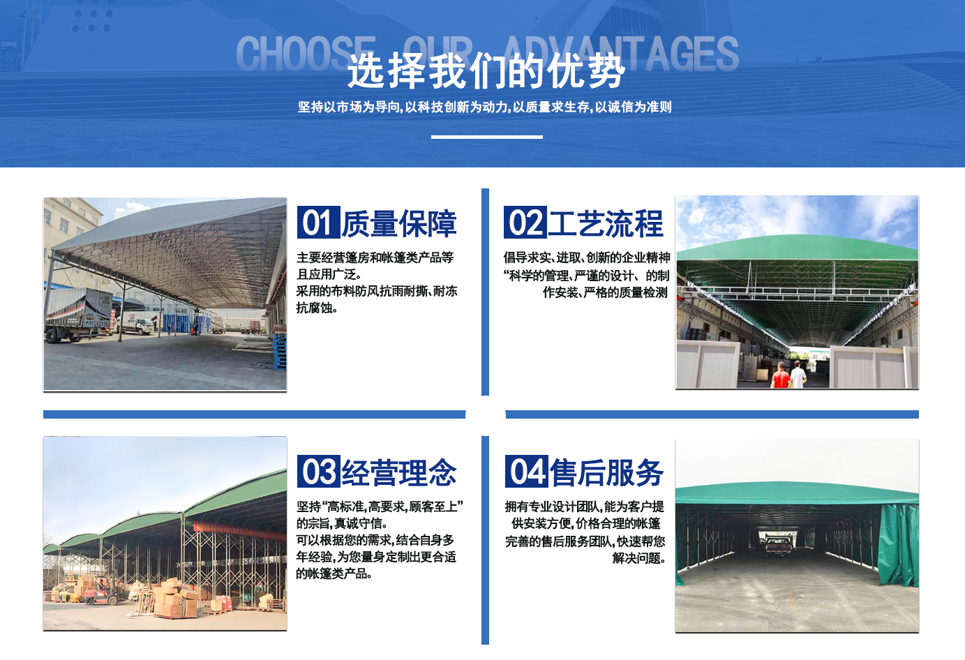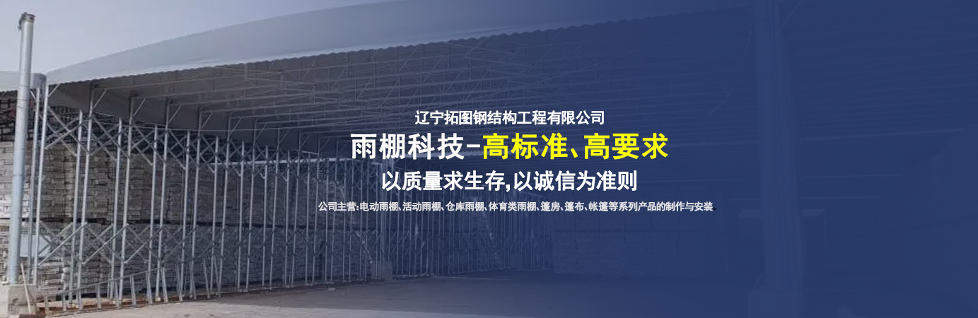 遼寧拓圖鋼結構工程有限公司是一家專業從事推拉篷設計、制作、安裝、使用、維修的綜合性公司。公司主營:電動雨棚、活動雨棚、倉庫雨棚、體育類雨棚、篷房、篷布、帳篷等系列產品的制作與安裝。 遼寧拓圖鋼結構工程有限公司堅持以市場為導向,以科技創新為動力,以質量求生存,以誠信為準則,倡導求實、進取、創新的企業精神?!翱茖W的管理、嚴謹的設計、 的制作安裝、嚴格的質量檢測、良好的后期服務成就企業的信譽,為您提供優質服務。 遼寧拓圖鋼結構工程有限公司傾力于開發應用三維空間結構與新材料的結合,將廣告藝術視覺表現形式與張力膜材科學的結合,推出多彩推拉蓬,依靠先進的科學技術,將推拉蓬建筑表現形式無限延伸,立志走在建筑科學的前沿,引導建筑時尚潮流,我們的目標是使推拉蓬建筑在中國發展壯大?! ?nbsp; 遼寧拓圖鋼結構工程有限公司憑著極強的事業熱情和豐富的專業經驗以“勤勉進取、銳意創新、至誠至信”的精神使公司得到迅速健康發展,業務范圍遍及全國??茖W的管理、嚴謹的設計、高標準的制作安裝流程,嚴格把控產品質量,熱誠的售后服務是企業競爭力的源泉。 遼寧拓圖鋼結構工程有限公司人愿以最誠摯的態度,歡迎廣大客戶的蒞臨與溝通!愿為市場提供優...